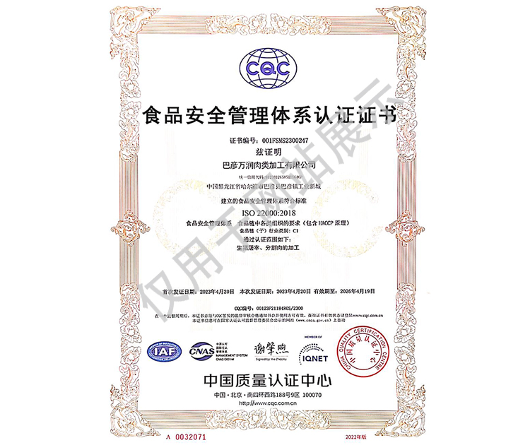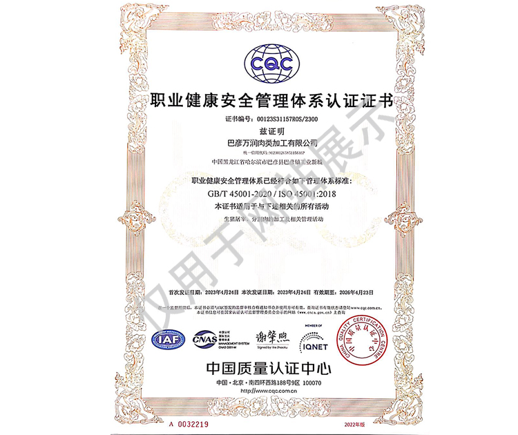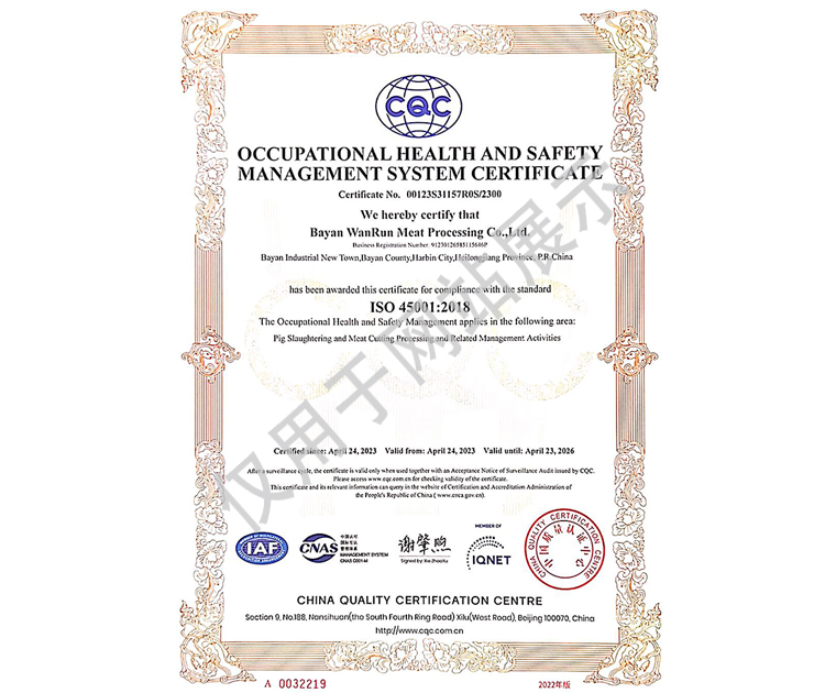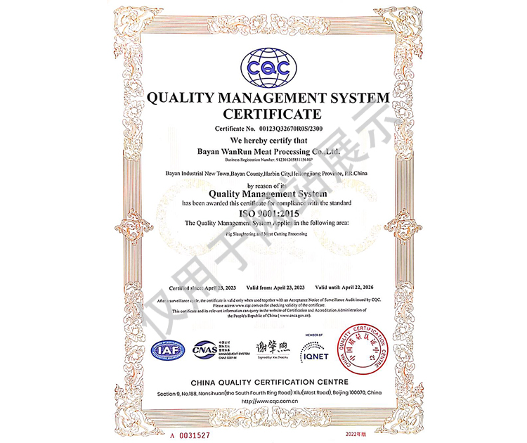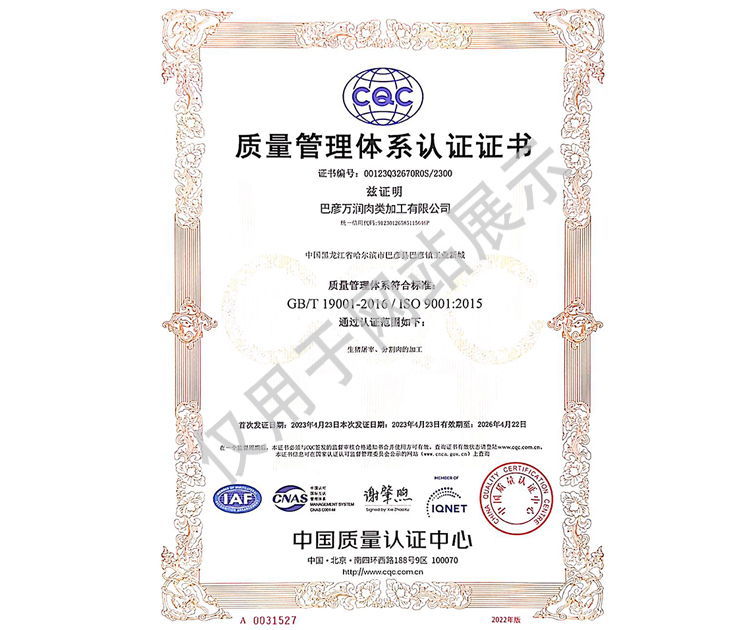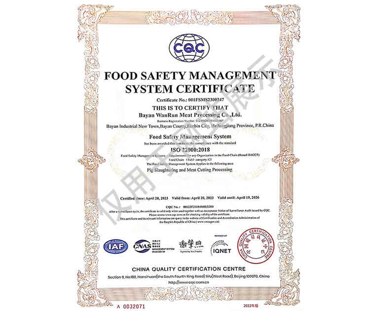 2016年公司(si)(si)通過(guo)了中(zhong)國(guo)(guo)質量(liang)認(ren)證中(zhong)心(xin)的(de)質量(liang)管理(li)體系(ISO9001)和食品(pin)安全(quan)管理(li)體系(ISO22000)認(ren)證;2017年已(yi)取得國(guo)(guo)家進出口企業(ye)認(ren)證;是中(zhong)國(guo)(guo)肉類(lei)協會會員單(dan)位(wei),黑龍江省肉類(lei)協會副會長單(dan)位(wei);2017年,公司(si)(si)產(chan)(chan)(chan)(chan)品(pin)經中(zhong)國(guo)(guo)綠色(se)(se)食品(pin)發展(zhan)中(zhong)心(xin)審核,被認(ren)定為(wei)(wei)綠色(se)(se)食品(pin)A級產(chan)(chan)(chan)(chan)品(pin);被省畜牧獸(shou)醫局確定為(wei)(wei)全(quan)國(guo)(guo)生豬(zhu)屠宰標(biao)準化(hua)創建示范(fan)企業(ye)(全(quan)國(guo)(guo)僅6家)。2018年12月,被評(ping)定為(wei)(wei)市級農(nong)業(ye)產(chan)(chan)(chan)(chan)業(ye)化(hua)重(zhong)點龍頭企業(ye)。2019年1月,被評(ping)定為(wei)(wei)省級農(nong)業(ye)產(chan)(chan)(chan)(chan)業(ye)化(hua)龍頭企業(ye)。