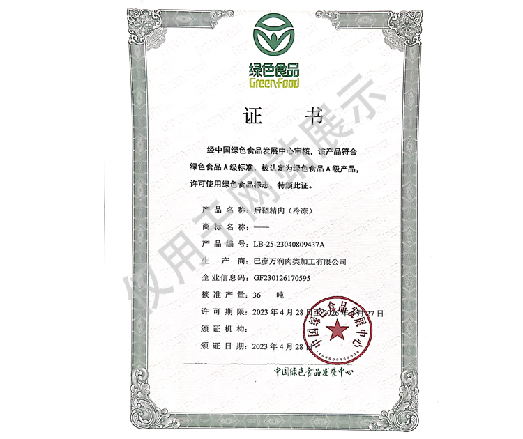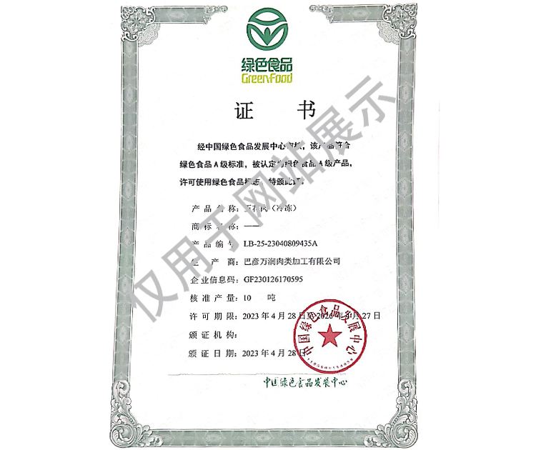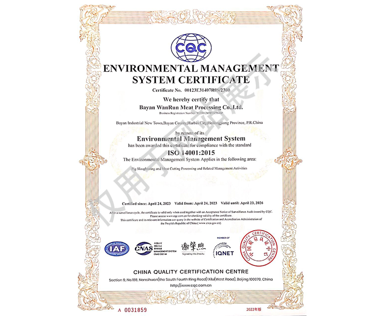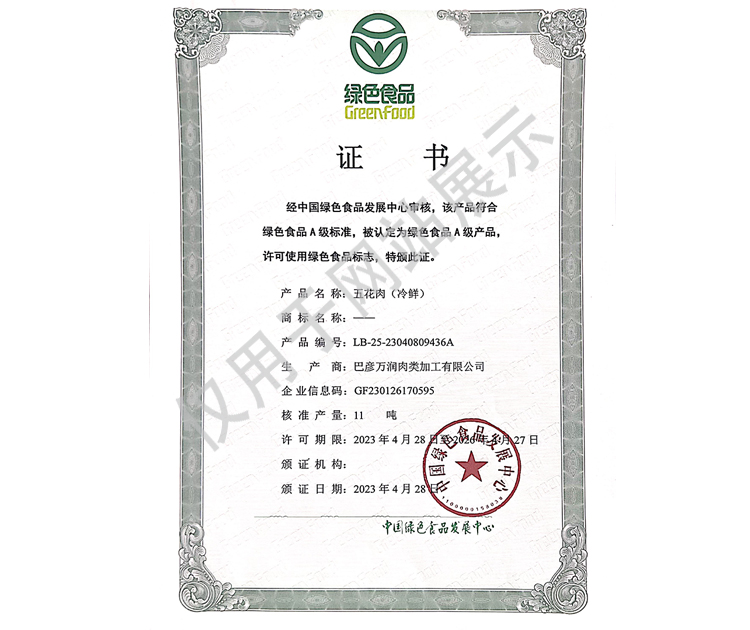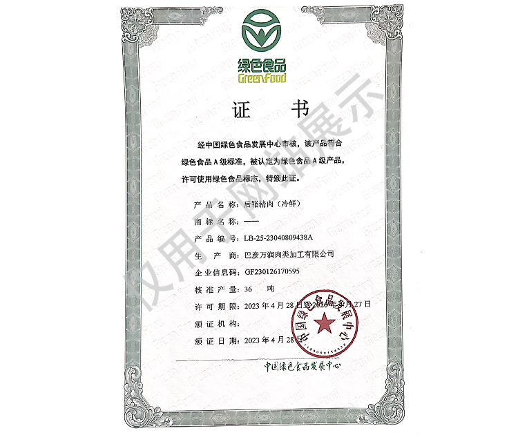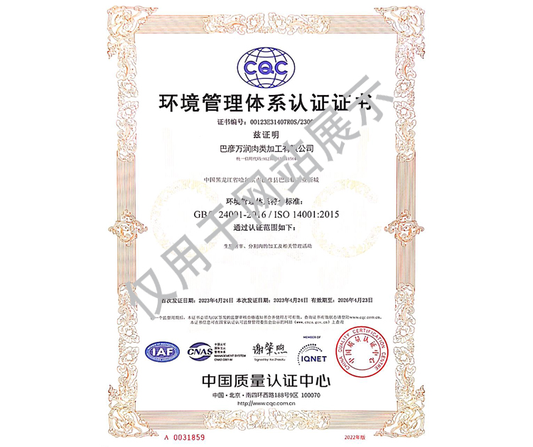 2016年公(gong)司(si)(si)通過了中(zhong)(zhong)國(guo)質量認證(zheng)中(zhong)(zhong)心的質量管(guan)(guan)理體系(xi)(ISO9001)和食品(pin)安(an)全管(guan)(guan)理體系(xi)(ISO22000)認證(zheng);2017年已取得(de)國(guo)家進出口(kou)企(qi)業認證(zheng);是中(zhong)(zhong)國(guo)肉類協會(hui)(hui)會(hui)(hui)員單位(wei),黑龍江省肉類協會(hui)(hui)副會(hui)(hui)長單位(wei);2017年,公(gong)司(si)(si)產(chan)品(pin)經(jing)中(zhong)(zhong)國(guo)綠色食品(pin)發(fa)展(zhan)中(zhong)(zhong)心審(shen)核,被(bei)認定(ding)為(wei)綠色食品(pin)A級產(chan)品(pin);被(bei)省畜牧(mu)獸(shou)醫局(ju)確定(ding)為(wei)全國(guo)生豬屠宰(zai)標準(zhun)化創建示范企(qi)業(全國(guo)僅6家)。2018年12月,被(bei)評定(ding)為(wei)市級農業產(chan)業化重點龍頭企(qi)業。2019年1月,被(bei)評定(ding)為(wei)省級農業產(chan)業化龍頭企(qi)業。
