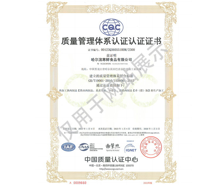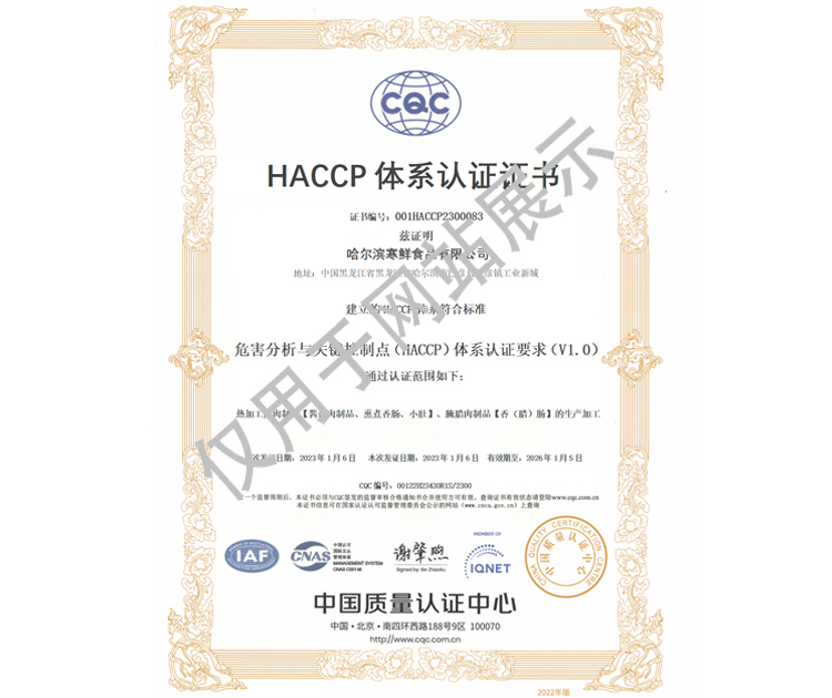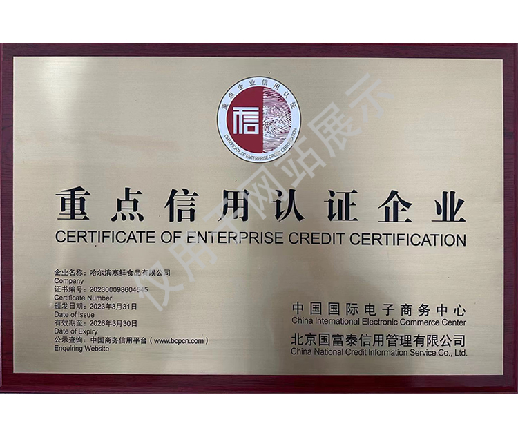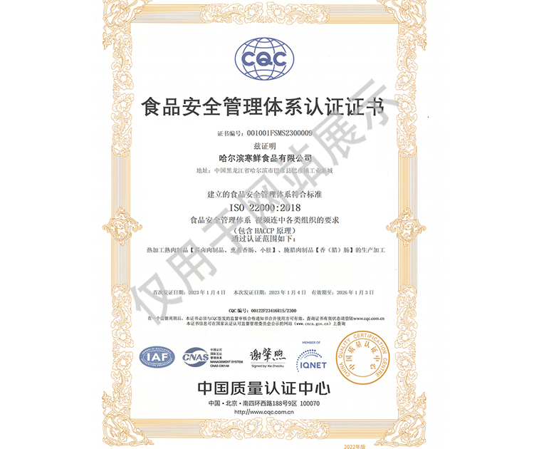 2016年(nian)(nian)公司通過了(le)中國(guo)質(zhi)量(liang)認(ren)證中心的質(zhi)量(liang)管(guan)理體系(xi)(ISO9001)和食(shi)品(pin)安全管(guan)理體系(xi)(ISO22000)認(ren)證;2017年(nian)(nian)已取得國(guo)家(jia)進出口企(qi)業(ye)(ye)認(ren)證;是中國(guo)肉類協會(hui)會(hui)員單(dan)位,黑龍(long)江(jiang)省肉類協會(hui)副(fu)會(hui)長單(dan)位;2017年(nian)(nian),公司產(chan)(chan)品(pin)經中國(guo)綠色食(shi)品(pin)發展中心審核,被認(ren)定(ding)為(wei)綠色食(shi)品(pin)A級(ji)產(chan)(chan)品(pin);被省畜牧獸醫局確定(ding)為(wei)全國(guo)生豬屠宰標準化(hua)(hua)創(chuang)建示范(fan)企(qi)業(ye)(ye)(全國(guo)僅(jin)6家(jia))。2018年(nian)(nian)12月(yue),被評(ping)定(ding)為(wei)市級(ji)農(nong)業(ye)(ye)產(chan)(chan)業(ye)(ye)化(hua)(hua)重點龍(long)頭企(qi)業(ye)(ye)。2019年(nian)(nian)1月(yue),被評(ping)定(ding)為(wei)省級(ji)農(nong)業(ye)(ye)產(chan)(chan)業(ye)(ye)化(hua)(hua)龍(long)頭企(qi)業(ye)(ye)。