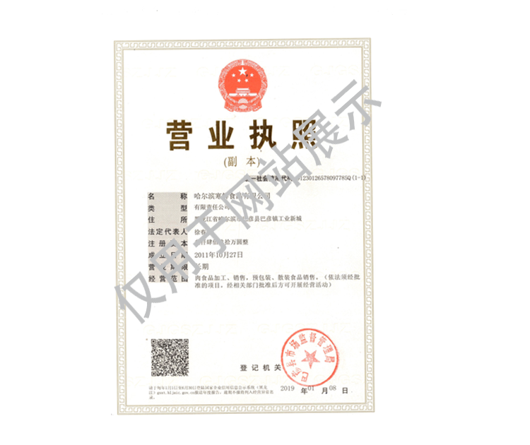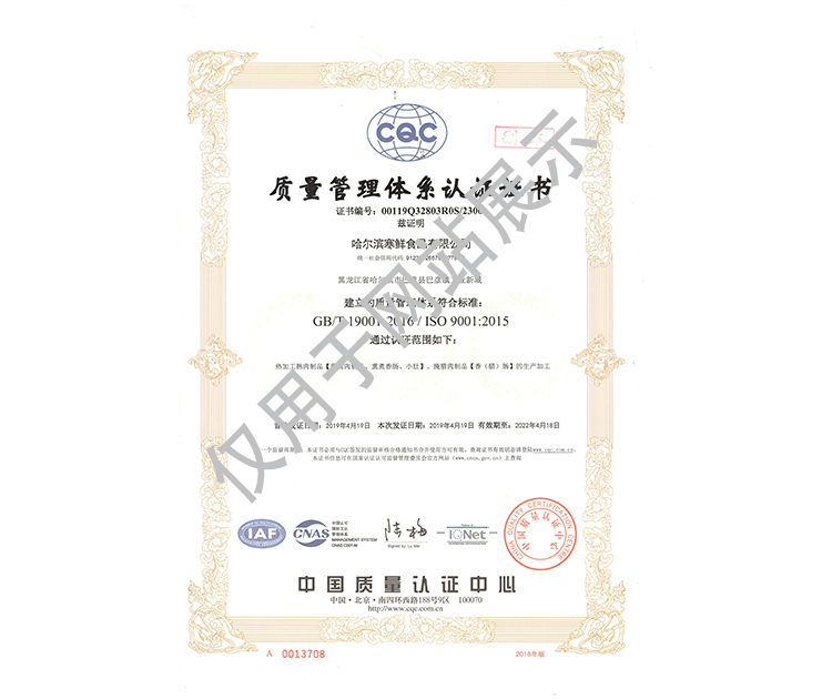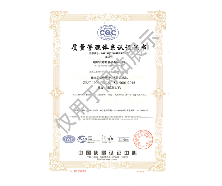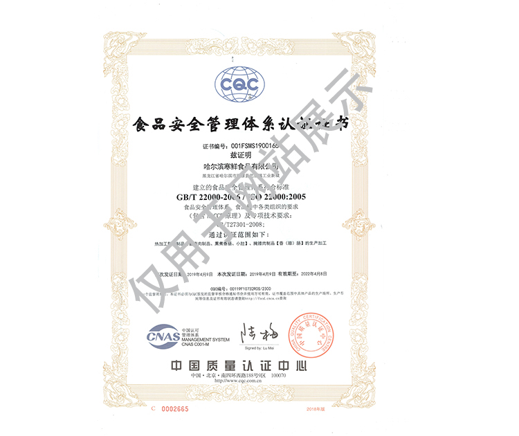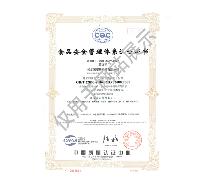 2016年公司(si)通過(guo)了中(zhong)(zhong)國(guo)質量(liang)認證中(zhong)(zhong)心(xin)的質量(liang)管理(li)體(ti)系(ISO9001)和食(shi)(shi)品(pin)安全管理(li)體(ti)系(ISO22000)認證;2017年已(yi)取(qu)得國(guo)家(jia)(jia)進出口(kou)企業(ye)認證;是中(zhong)(zhong)國(guo)肉類協(xie)(xie)會會員單位(wei)(wei),黑龍江(jiang)省(sheng)肉類協(xie)(xie)會副會長(chang)單位(wei)(wei);2017年,公司(si)產(chan)(chan)品(pin)經中(zhong)(zhong)國(guo)綠色食(shi)(shi)品(pin)發展(zhan)中(zhong)(zhong)心(xin)審核,被(bei)(bei)認定為(wei)綠色食(shi)(shi)品(pin)A級(ji)產(chan)(chan)品(pin);被(bei)(bei)省(sheng)畜牧獸(shou)醫局確定為(wei)全國(guo)生豬屠宰標準化創建示范企業(ye)(全國(guo)僅(jin)6家(jia)(jia))。2018年12月,被(bei)(bei)評(ping)定為(wei)市級(ji)農業(ye)產(chan)(chan)業(ye)化重點龍頭(tou)企業(ye)。2019年1月,被(bei)(bei)評(ping)定為(wei)省(sheng)級(ji)農業(ye)產(chan)(chan)業(ye)化龍頭(tou)企業(ye)。
