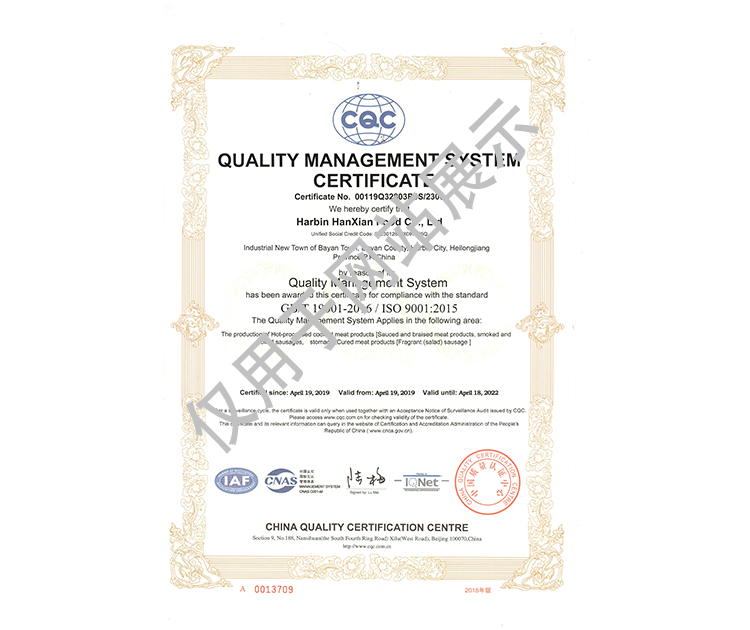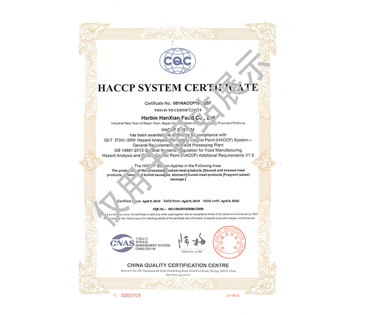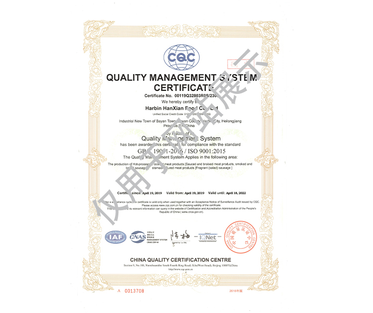 2016年公司(si)通過了中(zhong)國(guo)(guo)(guo)質(zhi)量(liang)認證中(zhong)心的質(zhi)量(liang)管理(li)體(ti)系(ISO9001)和(he)食品(pin)安全管理(li)體(ti)系(ISO22000)認證;2017年已(yi)取得(de)國(guo)(guo)(guo)家進出口企(qi)(qi)業(ye)認證;是(shi)中(zhong)國(guo)(guo)(guo)肉(rou)類(lei)協會(hui)(hui)會(hui)(hui)員單位,黑(hei)龍(long)江(jiang)省肉(rou)類(lei)協會(hui)(hui)副會(hui)(hui)長單位;2017年,公司(si)產品(pin)經中(zhong)國(guo)(guo)(guo)綠色食品(pin)發展中(zhong)心審(shen)核,被認定(ding)為(wei)綠色食品(pin)A級(ji)(ji)產品(pin);被省畜牧獸醫局確定(ding)為(wei)全國(guo)(guo)(guo)生(sheng)豬(zhu)屠宰標準化創建示(shi)范企(qi)(qi)業(ye)(全國(guo)(guo)(guo)僅6家)。2018年12月(yue),被評定(ding)為(wei)市(shi)級(ji)(ji)農(nong)業(ye)產業(ye)化重點龍(long)頭企(qi)(qi)業(ye)。2019年1月(yue),被評定(ding)為(wei)省級(ji)(ji)農(nong)業(ye)產業(ye)化龍(long)頭企(qi)(qi)業(ye)。